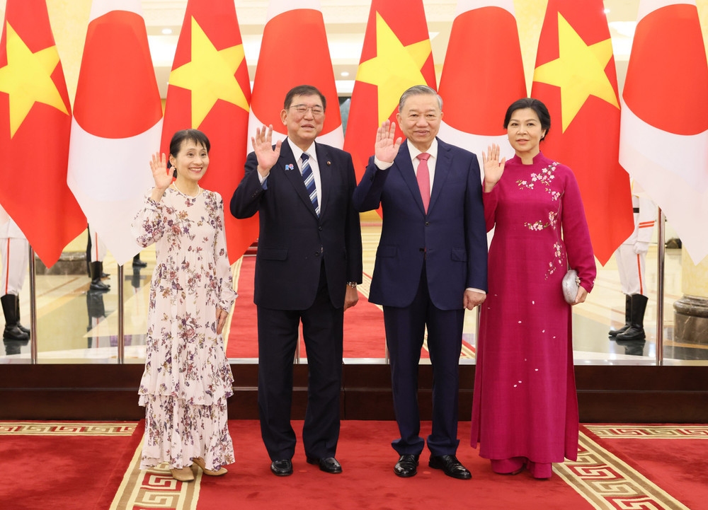 Thủ tướng Nhật Bản Ishiba Shigeru và Phu nhân Ishiba Yoshiko chụp ảnh kỷ niệm cùng Tổng Bí thư Tô Lâm và Phu nhân Ngô Phương Ly (27/4/2025)