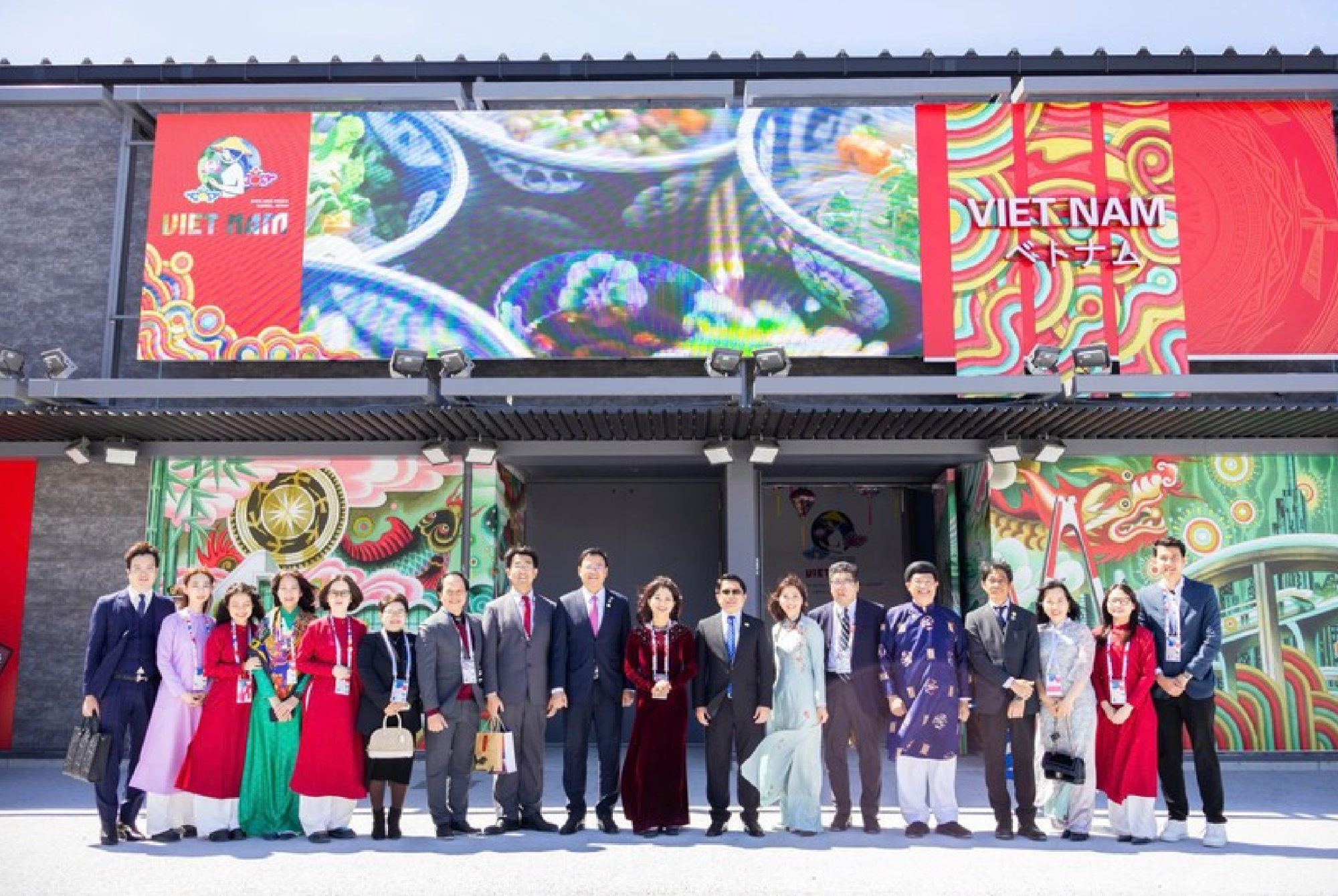 Đại sứ Phạm Quang Hiệu, Tổng Lãnh sự Ngô Trịnh Hà, Tổng đại diện Nguyễn Phương Hòa, cán bộ nhân viên Nhà Triển lãm và khách mời Nhật Bản chụp ảnh lưu niệm bên ngoài Nhà Triển lãm Việt Nam tại Triển lãm Thế giới Osaka. (Ảnh: Cục Hợp tác Quốc tế)