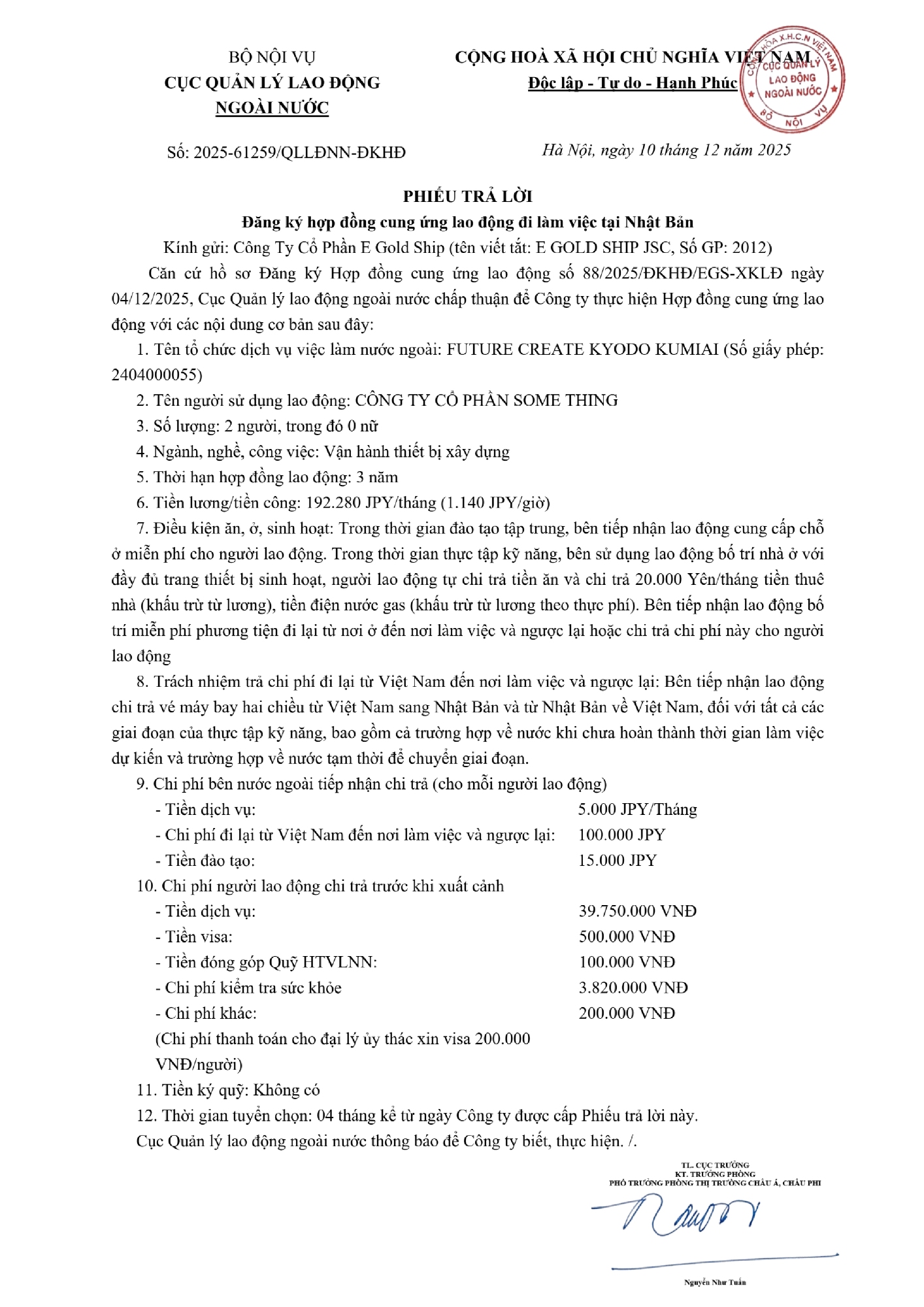 | Chế độ | Được tham gia đầy đủ quyền lợi theo Quy định của Chính phủ Nhật Bản |